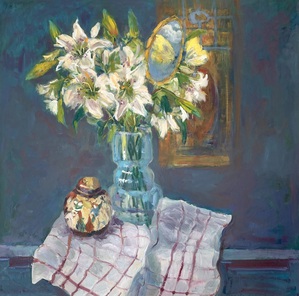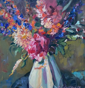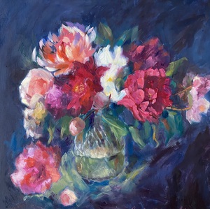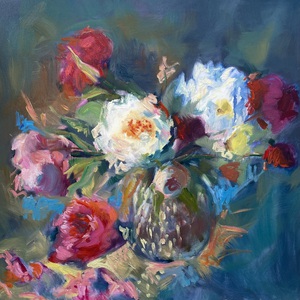 Mijn stillevens en interieurs zijn rijk van compositie en vol van kleur, contrast en gelaagdheid. Bloemen in volle bloei of juist op het punt van van verwelken, een kopje, een vaas, stoffen, fruit, met zorg gekozen en met aandacht geschikt. deze schilderijen nodigen uit tot langer kijken en belonen je met details die pas later opvallen.